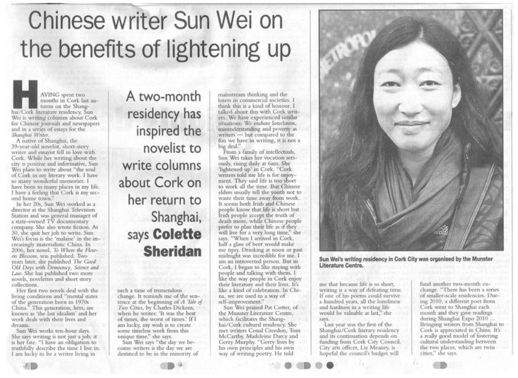 HAVING spent two months in Cork last autumn on the Shanghai/Cork literature residency, Sun Wei is writing columns about Cork for Chinese journals and newspapers and in a series of essays for the Shanghai Writer.